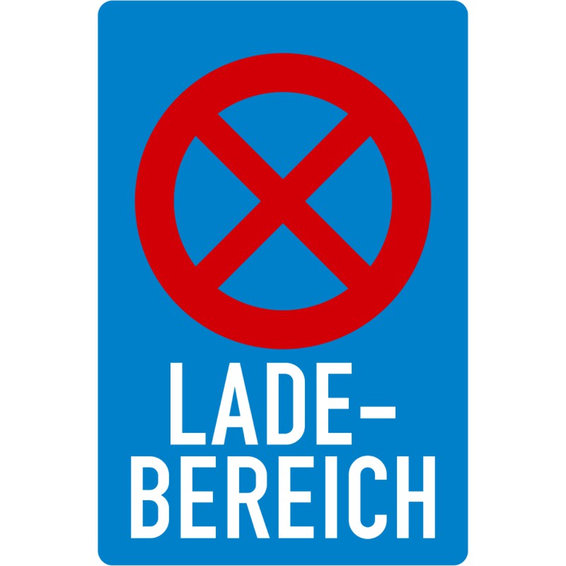Das Verkehrszeichen 230 “Ladebereich” ist ein rechteckiges Verkehrsschild mit blauem Grund, rotem Halteverbotssymbol oben und der weißen Aufschrift “LADEBEREICH” darunter.