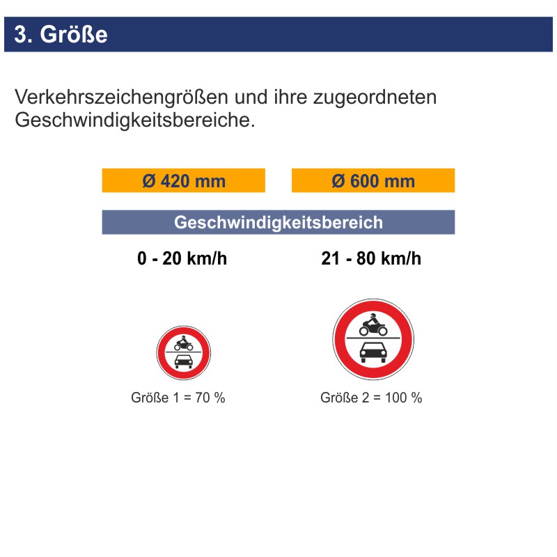 Besonderheit: Wenn einzelne Verkehrsarten ausgeschlossen werden, sind die vorherige Ankündigung sowie der Hinweis auf mögliche Umleitungen erforderlich. Informationen zu den Gründen für ein Verkehrsverbot wie etwa zeitlich begrenzte Maßnahmen zum Schutz kultureller Veranstaltungen und ähnliches bietet die Straßenverkehrsordnung § 45 Abs. 1 bis 1b.