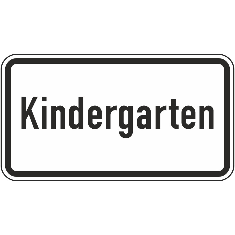 Das Verkehrszeichen 1012-51 „Kindergarten“ ist eine rechteckige Zusatztafel mit schwarzem Rand und der schwarzen Aufschrift „Kindergarten“ auf weißem Grund.
