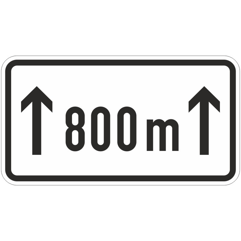 Das Verkehrszeichen 1001-30 „auf … m“ ist ein Rechteckschild mit weißem Grund, schwarzem Rand und schwarzer Beschriftung. Zwischen zwei nach oben weisenden Pfeilen zeigt eine Ziffer plus „m“ die Streckenlänge in Metern an. Die Entfernungsangaben werden auf- oder abgerundet: bei 100 m bis 500 m auf volle 50 m; 500 m bis 1000 m auf volle 100 m. Bitte geben Sie die gewünschte Ziffer für die Schildbeschriftung ein!