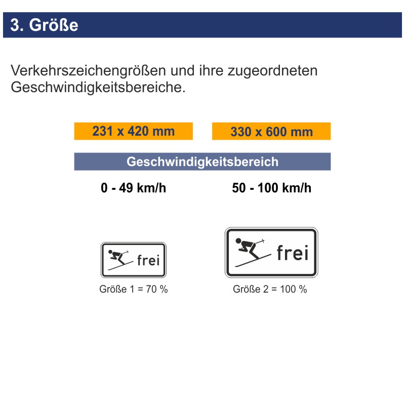 Bei den verschiedenen Verkehrszeichenarten, wie z.B. Gefahrenzeichen, Vorschriftenzeichen, Richtzeichen oder Zusatzzeichen, können Sie zwischen unterschiedlichen Größen wählen die sich an die vor Ort gefahrenen Geschwindigkeiten anpassen sollten. Ein kleines Beispiel um dies zu verdeutlichen: