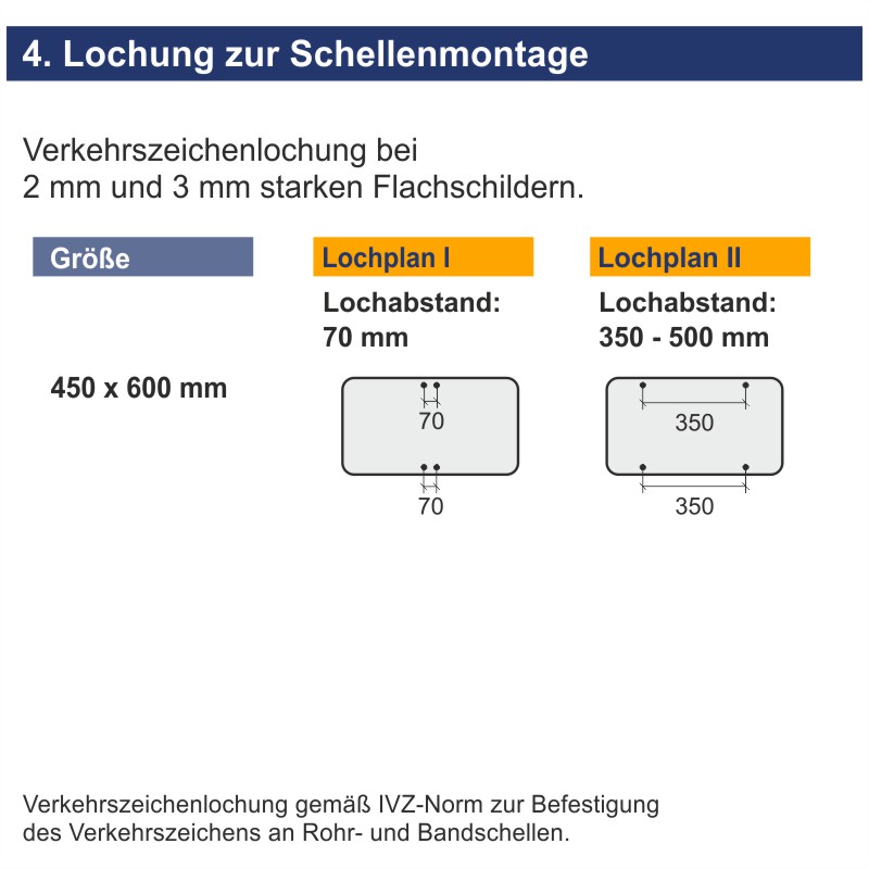 Gerne Lochen wir die Verkehrsschilder der Bauarten 2 mm und 3 mm nach Lochplan I (Lochabstand 70 mm) oder Lochplan II (Lochabstand 70 – 700 mm) für die von Ihnen gewählten Schilderschellen für die Verkehrszeichenmontage am Rundrohrpfosten oder Schildermasten. Selbstverständlich können Sie die Straßenschilder auch ohne Lochung bestellen – dies ist als Standard bei der Variantenauswahl bereits hinterlegt.