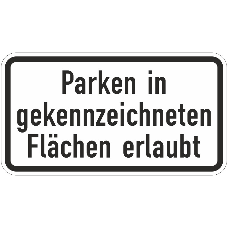 Das Verkehrszeichen 1053-30 „Parken in gekennzeichneten Flächen erlaubt“ ist ein weißgrundiges Zusatzschild in Rechteckform, mit schwarzer Umrandung und der schwarzen Aufschrift „Parken in gekennzeichneten Flächen erlaubt“.
