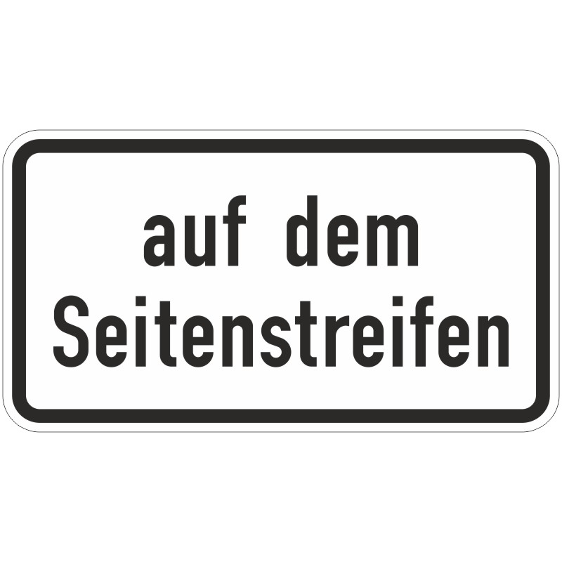 Das Verkehrszeichen 1053-34 „Auf dem Seitenstreifen“ ist ein rechteckiges Zusatzschild in Weiß mit schwarzem Rand und der schwarzen Aufschrift „auf dem Seitenstreifen“.