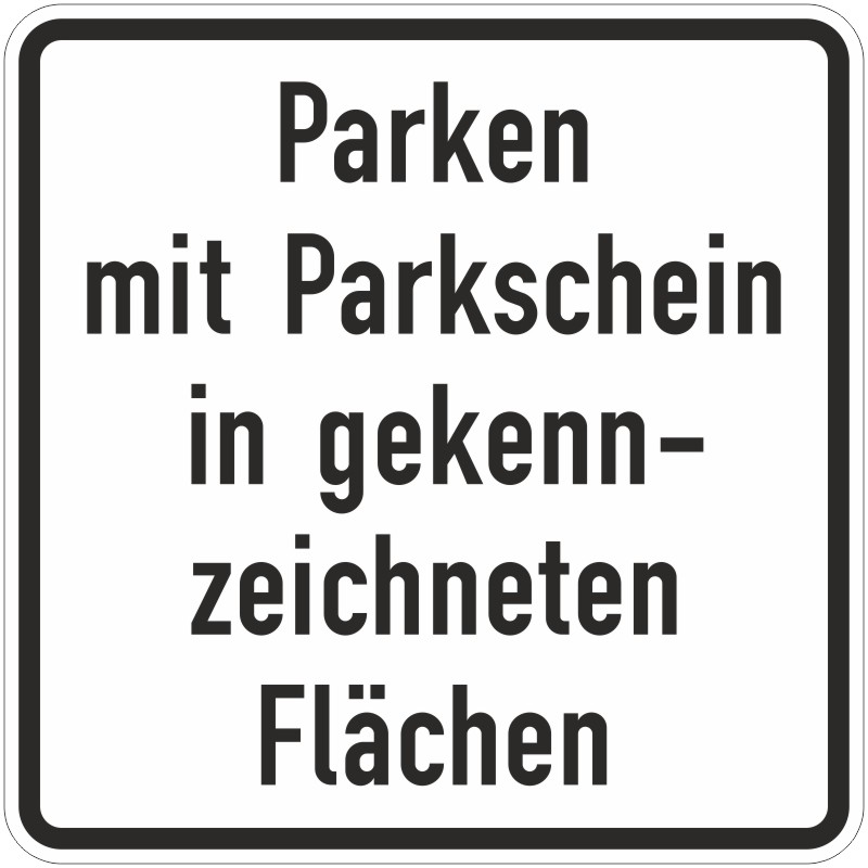 Unser Verkehrszeichen 1053-53 Parken mit Parkschein in gekennzeichneten Flächen erhalten Sie in den folgenden Bauarten: