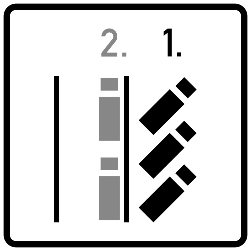 Einsatz: VZ 1053-57 kann mit dem Richtzeichen „Parken“ (VZ 314) kombiniert werden und macht deutlich, dass Lkw rechts in Schrägständen und bei Bedarf am rechten Rand der Fahrgasse abzustellen sind. Die Zusatztafel 1053-57 wird meist unterhalb des Verkehrszeichens, auf das sie sich bezieht, befestigt.