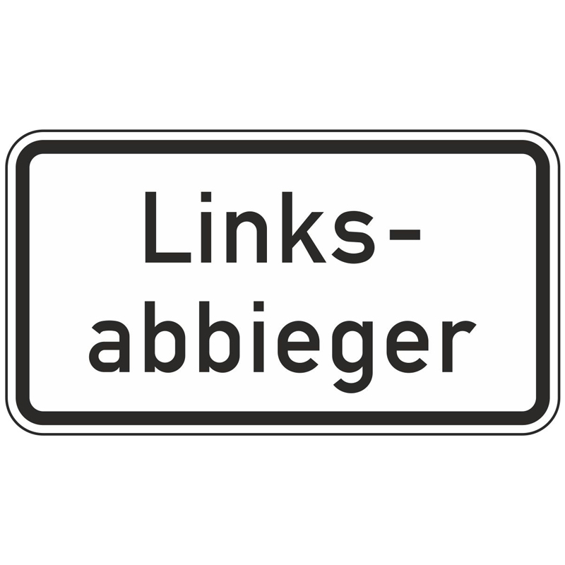 Das Verkehrszeichen 1007-54 „Linksabbieger“ ist ein Zusatzschild in Rechteckform mit weißem Grund, schwarzem Rand und der schwarzen Angabe „Linksabbieger“.
