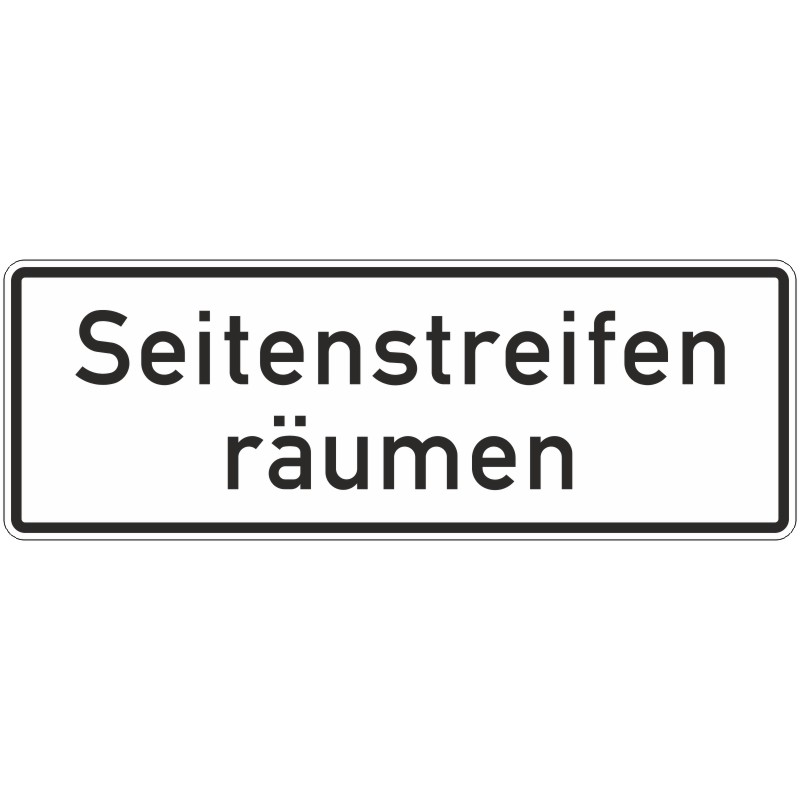 Das Verkehrszeichen 1013-51 „Seitenstreifen räumen“ ist ein rechteckiges Zusatzschild mit weißem Grund, schwarzem Rand und der schwarzen Aufschrift „Seitenstreifen räumen“.