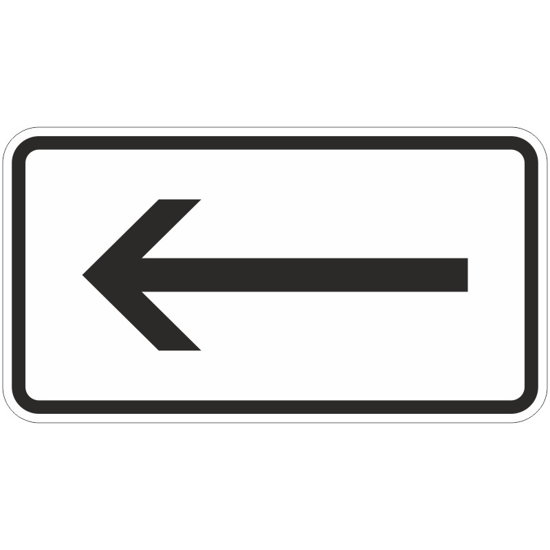 Das Verkehrszeichen 1000-10 „Richtung, linksweisend“ ist ein rechteckiges Zusatzschild mit weißem Grund und schwarzem Rand. Darauf ist in Schwarz ein waagerechter, linksweisender Pfeil abgebildet.