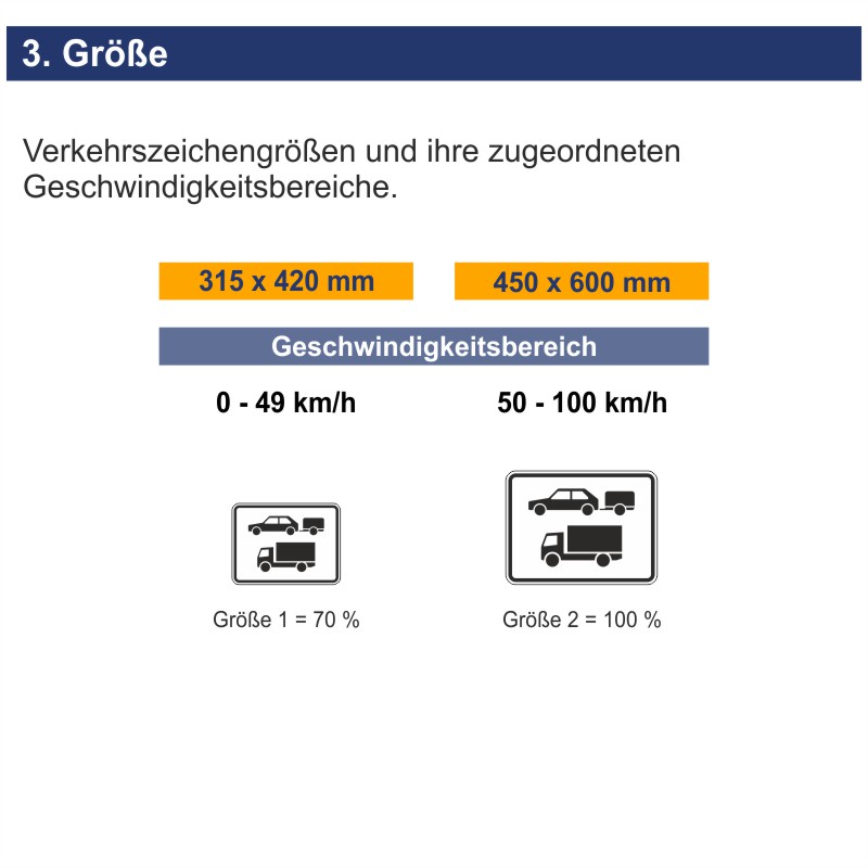 Bei den verschiedenen Verkehrszeichenarten, wie z.B. Gefahrenzeichen, Vorschriftenzeichen, Richtzeichen oder Zusatzzeichen, können Sie zwischen unterschiedlichen Größen wählen die sich an die vor Ort gefahrenen Geschwindigkeiten anpassen sollten. Ein kleines Beispiel um dies zu verdeutlichen: