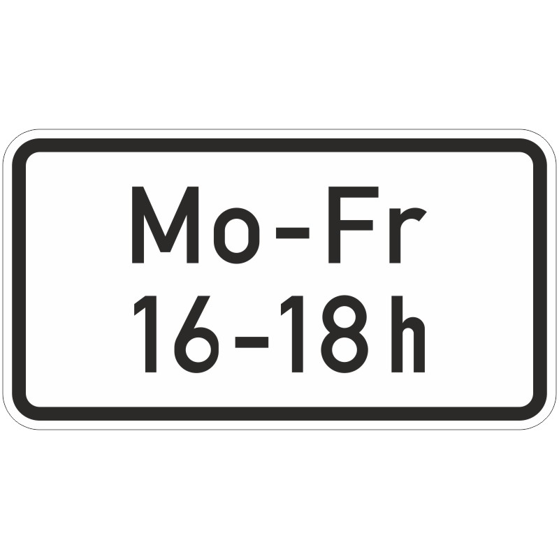 Das Verkehrszeichen 1042-33 „Zeitliche Beschränkung“ ist ein weißes Zusatzschild mit schwarzem Rand und der Angabe von Wochentagen (abgekürzt, von-bis) und der Uhrzeit (von-bis) plus „h“ in schwarzer Schrift. Bitte teilen Sie uns unter Punkt 5 des Auswahlmenüs Ihre individuellen Wünsche für die Schildbeschriftung mit!